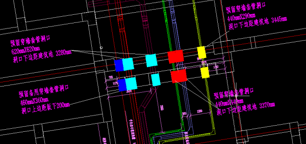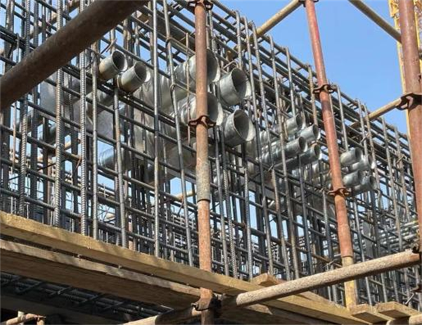 (4)機(jī)電預(yù)埋:項(xiàng)目人防區(qū)域兼做車庫應(yīng)用,一次結(jié)構(gòu)的預(yù)埋管件數(shù)量及種類繁多,在機(jī)電管線深化的起始階段,針對各專業(yè)圖紙進(jìn)行全面識圖,結(jié)合施工規(guī)范,對預(yù)埋套管的具體加工尺寸進(jìn)行統(tǒng)計(jì)。應(yīng)用BIM技術(shù)在管綜基礎(chǔ)上進(jìn)行預(yù)埋套管的模擬排布,其中強(qiáng)弱電預(yù)埋套管的大部分皆穿越人防門頂部,在此處需進(jìn)行精準(zhǔn)深化預(yù)埋。