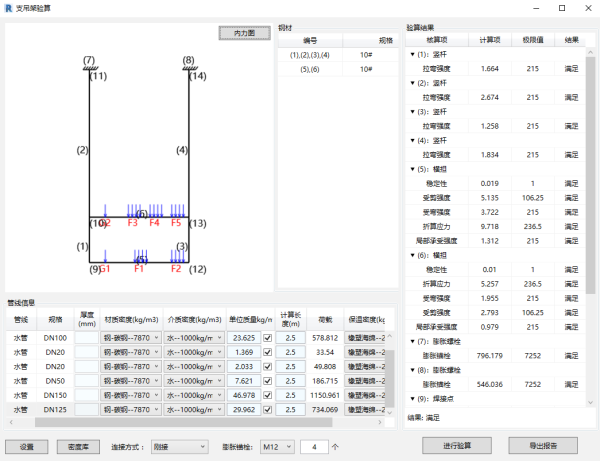 (6)支吊架驗(yàn)算:借助BIM軟件結(jié)合支吊架的安裝方案,進(jìn)行支吊架數(shù)據(jù)安全性的驗(yàn)算,出具支吊架計(jì)算書并得到設(shè)計(jì)院復(fù)核的簽字認(rèn)可。